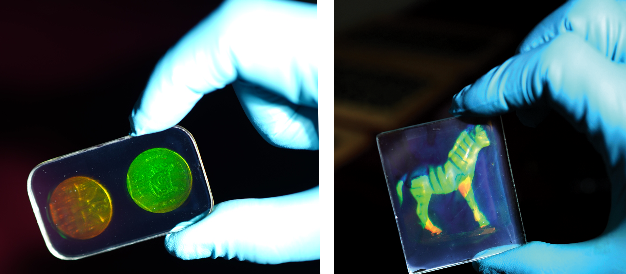 ![]() | Usually recorded by transmission or reflection method holograms can give us original depth feel of the recorded object in 3-dimension. Commercial use The valuable and artificial objects can be recorded with holography and displays in the museums, exhibitions to show peoples without original object like old coins, art works and heritage cultures. |